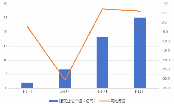 (三)從建筑業(yè)總產(chǎn)值看:建筑總產(chǎn)值同比增長(zhǎng)6.2%。從構(gòu)成看:建筑工程產(chǎn)值完成18.97億元,同比增長(zhǎng)7.4%,占比75.6%;安裝工程產(chǎn)值完成5.10億元,同比下降7.3%,占比20.3%;其他產(chǎn)值完成1.02億元,同比下降47.4%,占比4.1%。