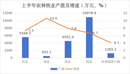 (一)農(nóng)林牧漁業(yè)穩(wěn)中有漲。上半年,大武口區(qū)第一產(chǎn)業(yè)增加值同比增長(zhǎng)7.2%,增加值增速在沿黃市轄區(qū)排名第1。農(nóng)林牧漁業(yè)總產(chǎn)值2.29億元,增長(zhǎng)6.9%。農(nóng)業(yè)產(chǎn)值0.56億元,同比增長(zhǎng)7.3%,占產(chǎn)業(yè)比重24.4%,拉動(dòng)農(nóng)林牧漁業(yè)總產(chǎn)值1.76個(gè)百分點(diǎn)。林業(yè)產(chǎn)值493萬(wàn)元,同比增長(zhǎng)10.6%,占產(chǎn)業(yè)比重2.2%,拉動(dòng)農(nóng)林牧漁業(yè)0.37個(gè)百分點(diǎn)。牧業(yè)產(chǎn)值0.46億元,同比增長(zhǎng)7.9%,占產(chǎn)業(yè)比重20%,拉動(dòng)農(nóng)林牧漁業(yè)總產(chǎn)值1.46個(gè)百分點(diǎn)。漁業(yè)產(chǎn)值1.1億元,同比增長(zhǎng)6.7%,占產(chǎn)業(yè)比重48%,拉動(dòng)農(nóng)林牧漁業(yè)總產(chǎn)值3.08個(gè)百分點(diǎn)。農(nóng)林牧漁服務(wù)業(yè)產(chǎn)值0.13億元,同比增長(zhǎng)4.1%,占產(chǎn)業(yè)比重5.5%,拉動(dòng)農(nóng)林牧漁業(yè)總產(chǎn)值0.24個(gè)百分點(diǎn)。